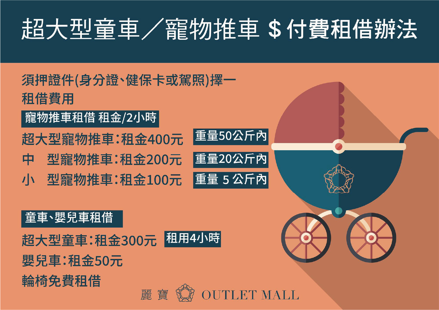 ● 以上推車僅限麗寶outlet mall館內乘坐,並請於當日營業時間閉店前歸還。